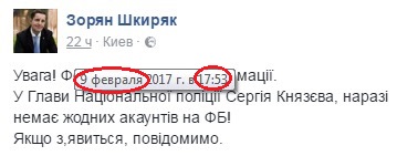 Советник министра внутренних дел Зорян Шкиряк 9 февраля в 17.53 сообщил о том, что у Князева нет ни одного аккаунта на Facebook, а существующий – фейковый. И, действительно, ко времени его поста личная страница Князева уже была удалена.