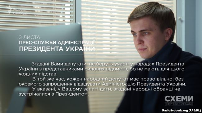 «Згадані Вами депутати не беруть участі у нарадах президента України з представниками силових відомств, бо не мають для цього жодних підстав. У той же час кожен народний депутат має право вільно, без окремого запрошення відвідувати Адміністрацію президента України. У вказані у Вашому запиті дати згадані народні обранці не зустрічалися з президентом», – йдеться у відповіді прес-служби Адміністрації президента на запит програми.