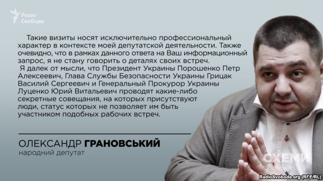 «Такі візити мають виключно професійний характер у контексті моєї депутатської діяльності. Також очевидно, що в рамках даної відповіді на Ваш інформаційний запит я не буду говорити про деталі своїх зустрічей. Я далекий від думки, що президент України Порошенко Петро Олексійович, голова Служби безпеки України Грицак Василь Сергійович і генеральний прокурор України Луценко Юрій Віталійович проводять будь-які секретні наради, на яких присутні люди, статус яких не дозволяє їм бути учасником подібних робочих зустрічей», – зазначив він.