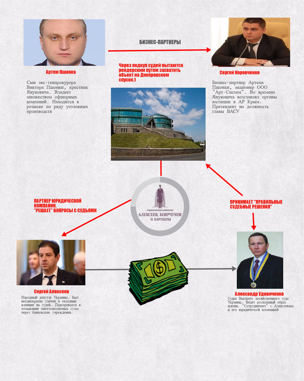 Особое внимание обращает на себя тот факт, что большую активность в этом деле проявляет народный депутат Украины Сергей Алексеев, бывший адвокат (партнер юридической компании "Алексеев, Боярчуков и партнеры"), который был неоднократно уличен в оказании давления на судей при принятии решений, а также подозревался в отмывании многомиллионных сумм через банковские учреждения. Вот, например, видео, где голос, очень похожий на Алексеева предлагает взятку в $ 5 000 судье Хозяйственного суда города Киева Дидченко.