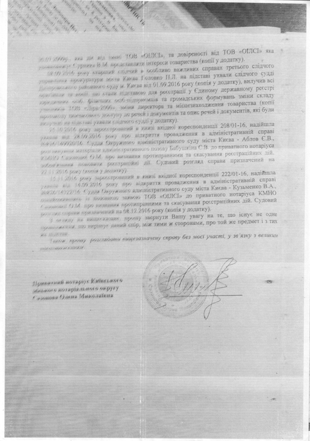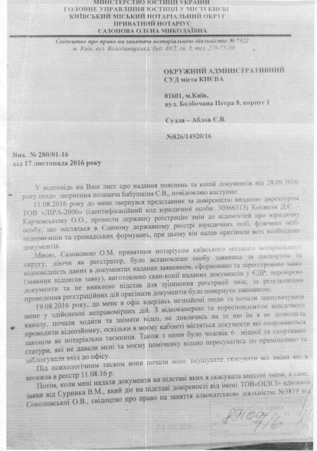 В ход пошли откровенно преступные методы. Например, 19.08. 2016 года в офис к нотариусу Сазоновой ворвались незнакомые люди, начали оказывать психологическое давление, целью которого было заставить нотариуса отменить регистрационные действия, что впоследствии и было осуществлено. Об этом становится известно из копии пояснений, которые нотариус направила в Окружной административный суд города Киева.