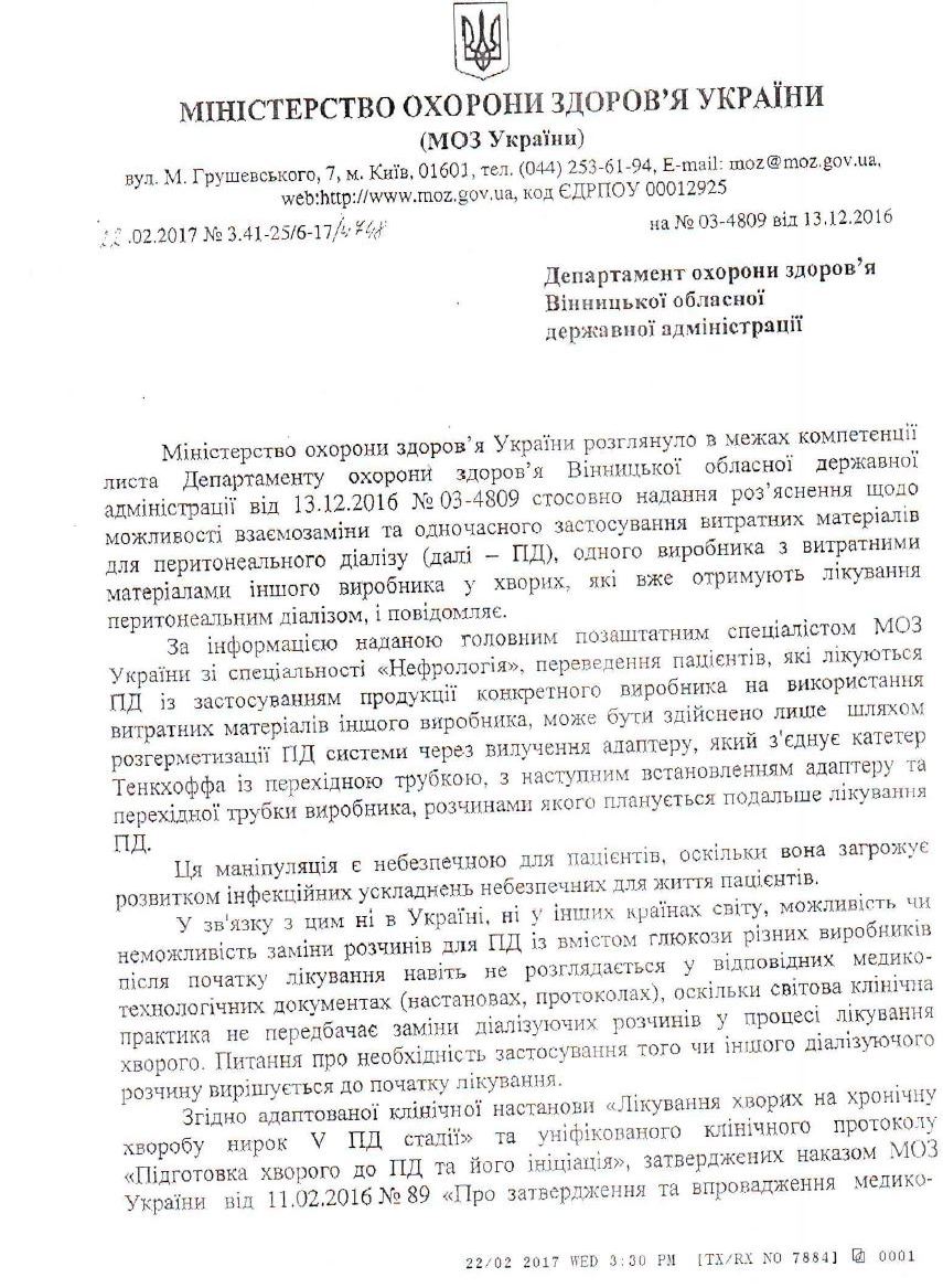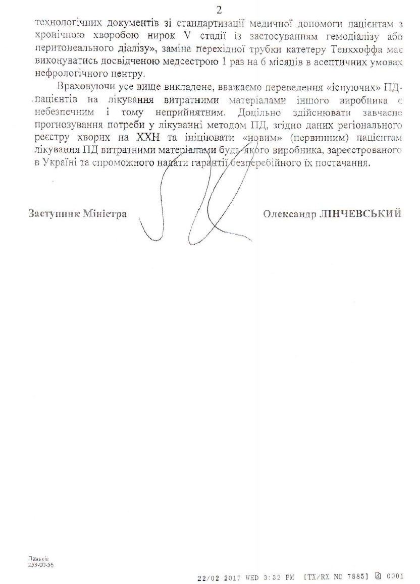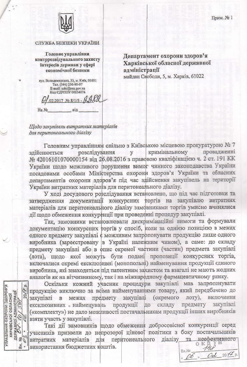У листах представника спецслужби лікарям вказують на кримінальне провадження №42016101070000154 від 28.06.2016, яке веде Київська місцева прокуратура №7 по «можливим порушенням» закону чиновниками МОЗ та облздоровів під час закупівлі витратних матеріалів для перитонеального діалізу.