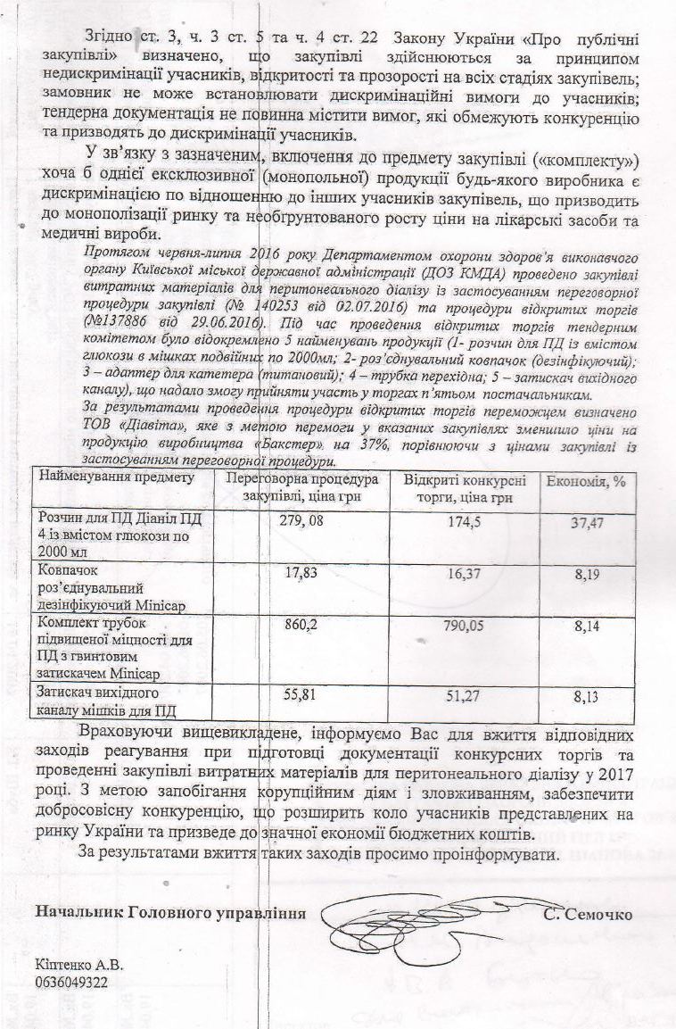 Управління контррозвідки Семочка здійснює супровід провадження №4201510007000028 від 06.11.2015 щодо можливого порушення законів при реалізації товарів для перитонеального діалізу фірмою «Діавіта», яка нині і є ексклюзивним представником «Бакстера» в Україні.