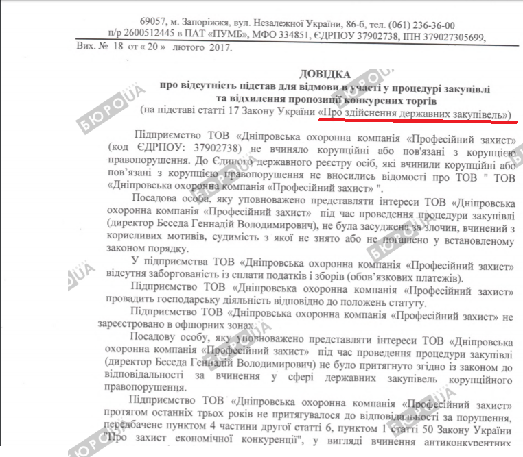 Так, 27 февраля 2017 года состоялись торги, по результатам которых подряд на оказание услуг по охране ряда объектов достался ООО «Днепровская охранная компания профессиональная защита». Ценовое предложение компании составило 2 868 012 гривен.