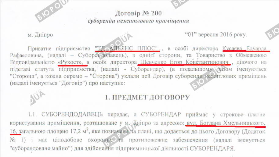 Фирма была зарегистрирована в ноябре 2014 года. С июля 2016 года руководить компанией стал двадцатидвухлетний Егор Шевченко. А спустя месяц на счета «Рукоста» от Департамента благоустройства и инфраструктуры Днепровского горсовета начали поступать деньги за услуги охраны различных объектов. В числе прочих документов тендерного предложения ООО «Рукост» мы нашли договор субаренды нежилого помещения по улице Богдана Хмельницкого,16 в Днепре. Исходя из текста документа, арендовал помещение «Рукост» у ЧП «ТД Альянс плюс».