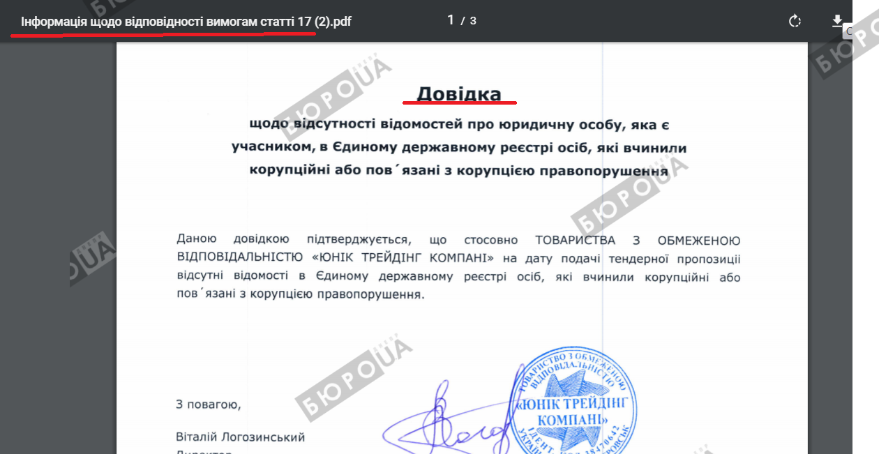 Так, к примеру, победившее в тендере на поставку помп ООО «ЮТК» прикрепило к тендерной документации три справки: об отсутствии налогового долга, об отсутствии судимости должностного лица за преступление, совершенное из корыстных мотивов и отсутствии ведомостей в реестре лиц, совершивших коррупционные правонарушения. В соответствии с каким законом заказчику предоставляется данная документация участник вообще не посчитал нужным указывать. Это не помешало КП заключить с компанией договор на сумму 5 269 959 гривен.
