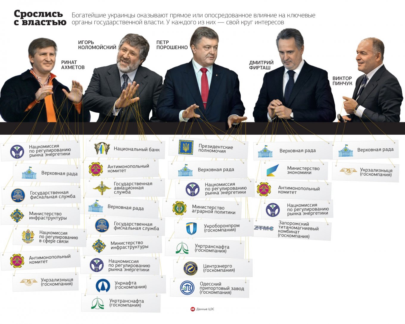 Аналитики центра определили, что лишь Ахметова, Коломойского, Пинчука, Порошенко и Фирташа можно назвать предпринимателями, которые подпадают под классическое определение олигархов, обладающих триадой: активами в бизнесе, влиянием в политике и медиасобственностью. И именно они, основываясь на подобном фундаменте, поставили государство себе на службу, монопольно контролируя целые отрасли посредством влияния на ключевые госорганы.