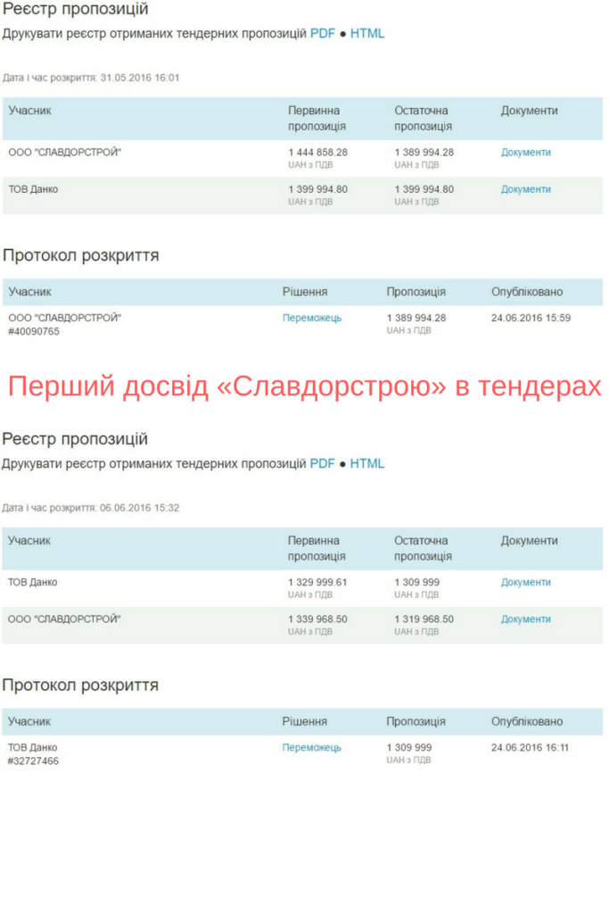 Ось з таким підґрунтям 5 липня у Попасній проводиться розкриття тендерних пропозицій за участю ТОВ «Данком». У двох тендерах перемогло ТОВ «Славдорстрой», однак у цей же день було проведено ще одні торги. За участю тих самих ТОВ «Данком» та ТОВ «Славдорстрой. Але на цей раз підряд на 11,94 млн виборов «Данком». Відмічаємо, як ці двоє майже дзеркально «конкурували» у двох тендерах.