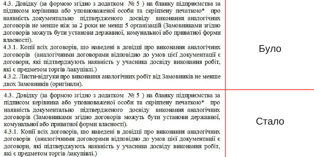 У новому варіанті тендерної документації просто потрібно підтвердити досвід виконання робіт без норми про «не менше, ніж 2 роки від не менш 5 організацій», прибрано підпункт про необхідність листів-відгуків.