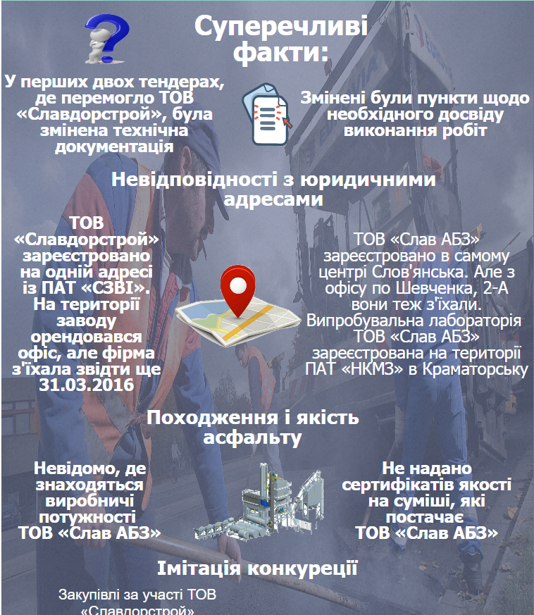 У наданих до тендерів «Славдорстроєм» довідках про наявність асфальтобетонного заводу та договорах на поставку асфальтобетонних сумішей із «Слав АБЗ» будь-яких інших адрес не вказано. Тому залишається відкритим питанням, де було вироблено той асфальт, документи на який були надані ТОВ «Славдорстрой» до тендеру на поточний ремонт внутрішньо квартальних проїздів та прибудинкових територій у Слов’янську, проведений в липні 2016 року.
