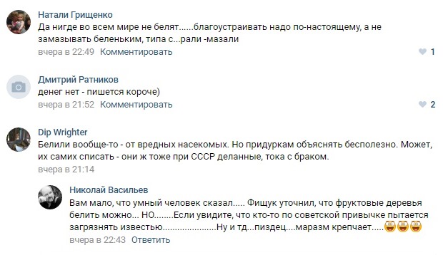 Комментарии интернет-пользователей новости о том, что в Киеве запретили белить все деревья, кроме фруктовых, все или негативные, или с сарказмом, или в лучшем случае с иронией. Киевляне отмечают, что вместо того, чтобы заниматься насущными коммунальными проблемами – разбитыми дорогами, курящими в общественных местах, бездомными животными, нехваткой мест в детсадах и так далее – в головах у чиновников Киевской горгосадминистрации завелась «политическая тля».