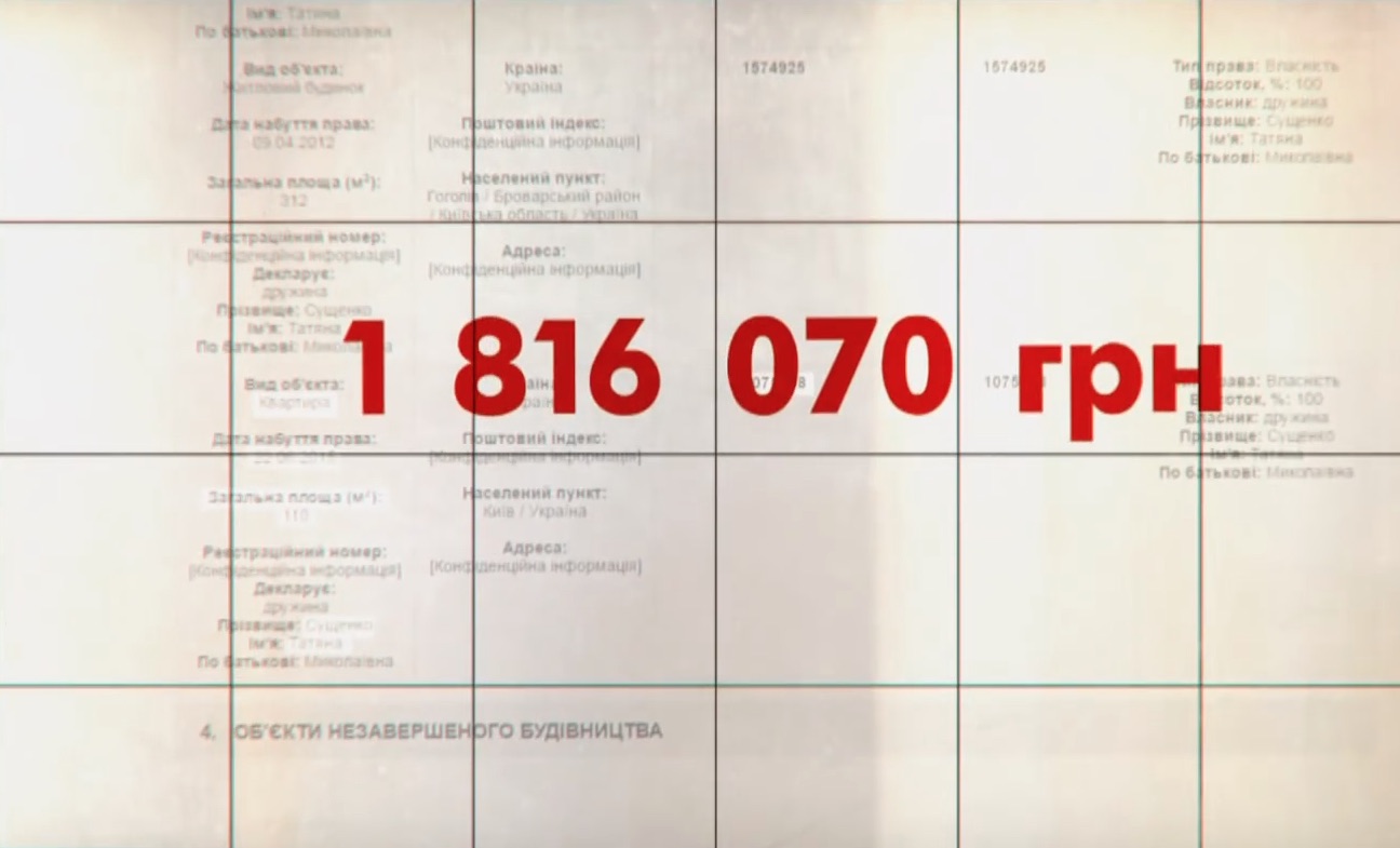 Это фиксация коррупции в особо крупных размерах. Но Сущенко лишь уволили. Ни служебного расследования, ни уголовного дела. Чиновник исчез, оставив после себя имения, записанные на жену, элитную недвижимость в столице, земельный участок и задекларированные доходы, которые позволили бы все это приобрести примерно за лет 600.