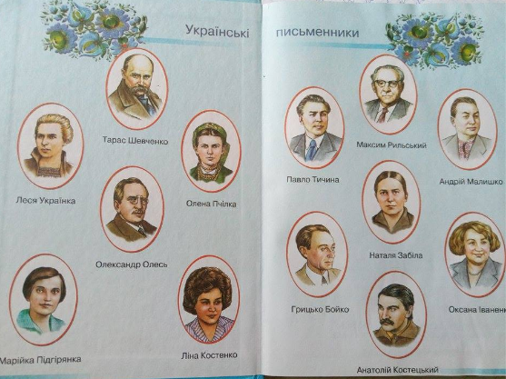 Листаем дальше. Опять крамола! На странице учебника нарисованы Украинские писатели: Шевченко, Костенко, Тичина, Леся Украинка и другие.