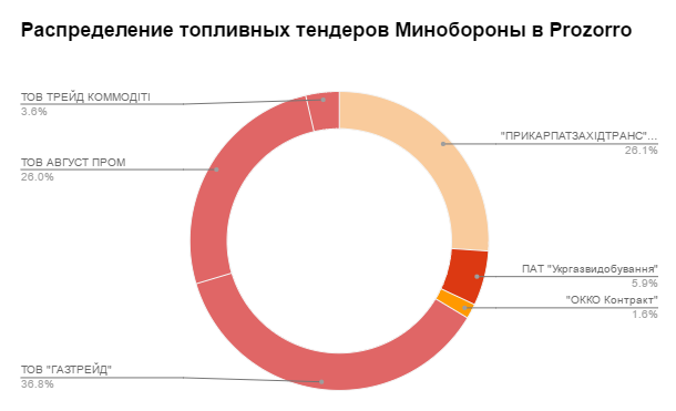 В целом же группа «Трейд коммодити» де-факто установила монополию на поставках топлива для военных. По подсчетам «ОЛИГАРХА», за последний год Минобороны провело через Prozorro 18 закупок топлива, в основном дизеля и авиационного газа, и 70% поставок в денежном выражении пришлось на эту тройку.