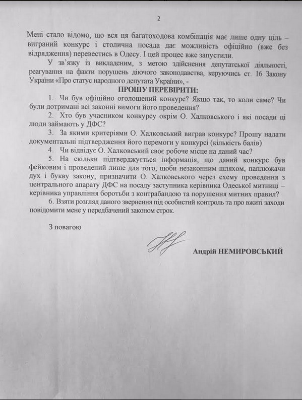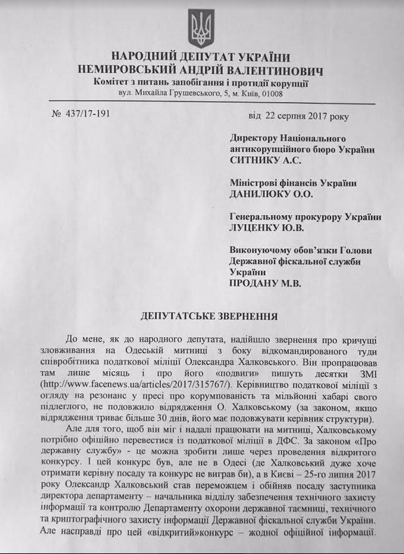 Член Комитета Верховной Рады Украины по вопросам предупреждения и противодействия коррупции Андрей Немировский обратился с официальным запросом к главе Национального антикоррупционного бюро и Генеральному прокурору Украины с требованием пресечь реализацию сомнительной схемы перевода в центральный аппарат ГФСУ одиозного сотрудника Налоговой милиции Киева Александра Халковского с целью дальнейшего назначения начальником Управления по борьбе с контрабандой и нарушением таможенных правил Одесской таможни.