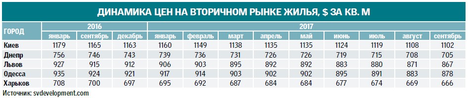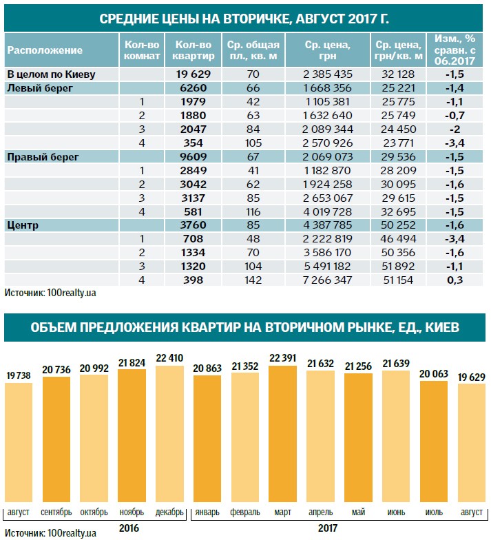 Средняя стоимость "вторички" снижается по всей территории Украины почти равномерно, с более глубоким проседанием в небольших городах. Не устояла и столица: согласно ежемесячному отчету информационно-аналитического портала "Столичная недвижимость", в августе 2017 г. средняя цена кв.м в Киеве уменьшилась на 1,5% по сравнению с июлем и составила 32,128 тыс. грн/кв.м. А с августа 2016 г. квартиры на вторичном рынке в Киеве подешевели в среднем уже на 7,9%.