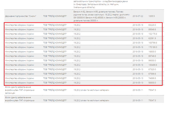 По данным «ОЛИГАРХА», компанией-поставщиком топлива, которая фигурирует в материалах указанного производства, является ООО «Трейд Коммодити» — прокладка из г. Каменское Днепропетровской области с уставным капиталом 7,4 тыс. гривен, ставшая главным фаворитом государственных тендеров на закупку топлива в прошлом году (если в 2015 оборот «Трейд коммодити», по данным «ОЛИГАРХА», составлял 700 млн гривен, то в 2016 вырос впятеро до 3,5 млрд гривен). Расследование «ОЛИГАРХА» первоначально продемонстрировало связь этой компании с окружением Игоря Грынива, который на тот момент был главой фракции Блока Петра Порошенко в парламенте. Позднее связь с «Трейд коммодити» признал скандально известный бизнесмен Андрей Адамовский — старший бизнес-партнер нардепа от БПП Александра Грановского, которого называют «правой рукой» первого замглавы президентской фракции в парламенте Игоря Кононенко.