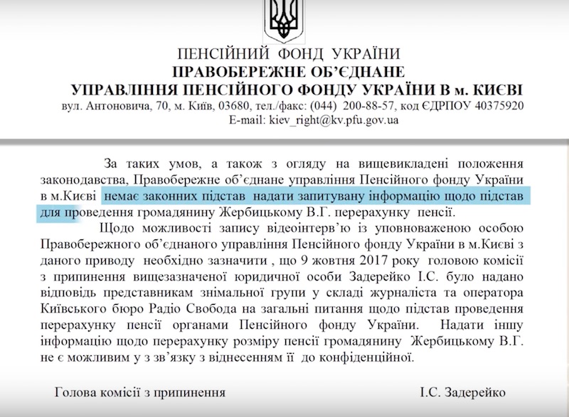 Согласно декларации за 2015 год Жербицкий получал пенсию около 15 000 гривен, но после решения суда в 2016 году его ежемесячная пенсия составила около 40 000 грн. Управление Пенсионного фонда поначалу сопротивлялось: прокурору в пересчете пенсии было отказано, потом подали апелляцию. Для того, чтобы высшая инстанция пересмотрела дело, нужно было заплатить 606 грн судебного сбора, но в течение месяца этого не было сделано. Поэтому апелляционный суд не взялся за данное дело. Управление пенсионного фонда отказалось предоставить какие-либо объяснения. Более того, суд решил скрыть свое решение о пересчете пенсии Жербицкому.
