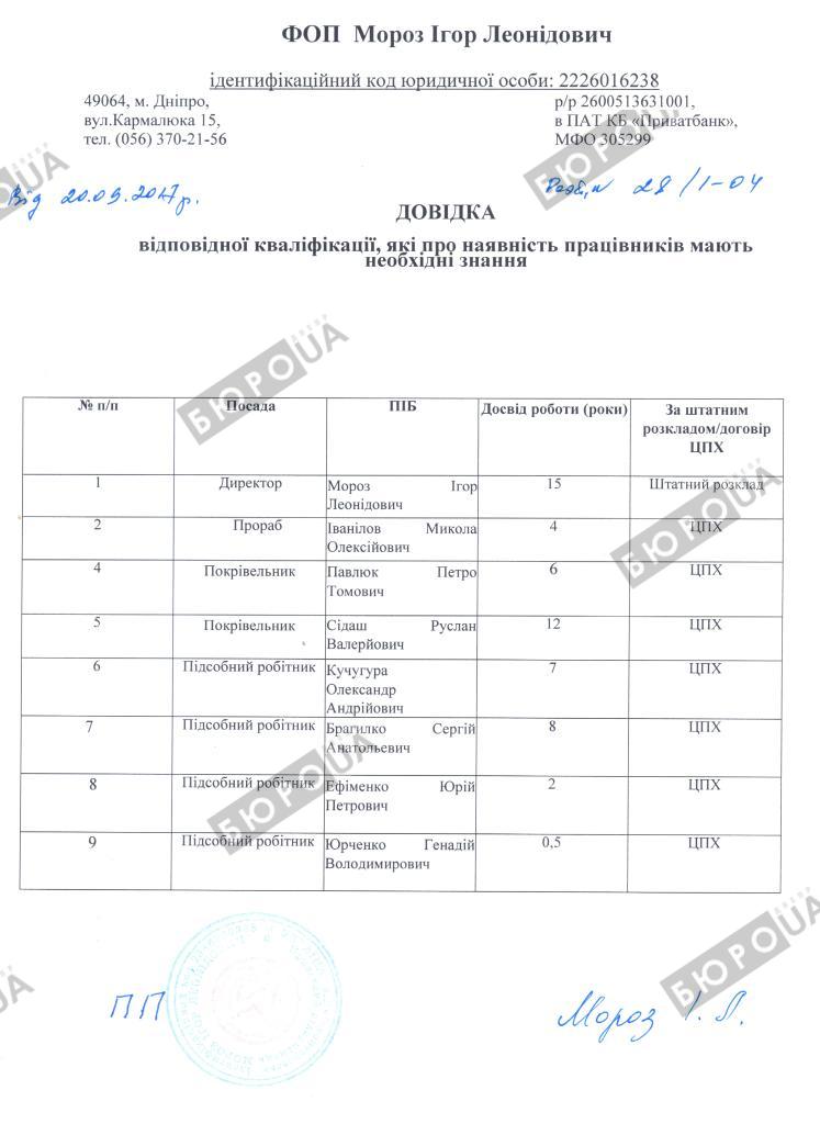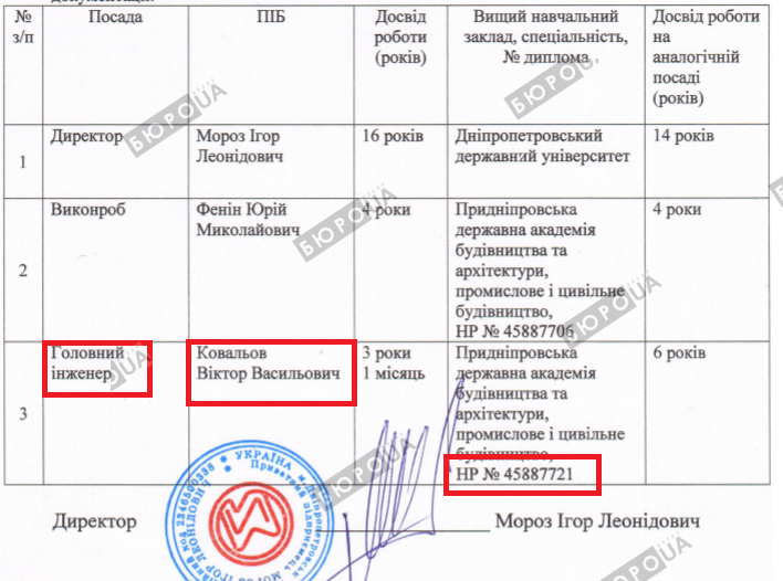 Этого же сотрудника, с таким же номером диплома (!) указывает, подавая документы на тендеры, и Игорь Мороз. Правда у Мороза Ковалев с лета 2014 года работает главным инженером. Прорабом трудится Юрий Фенин.