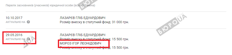 Согласно данным YouControl, по состоянию на 29 мая 2016 года Мороз еще находился в составе учредителей ООО.