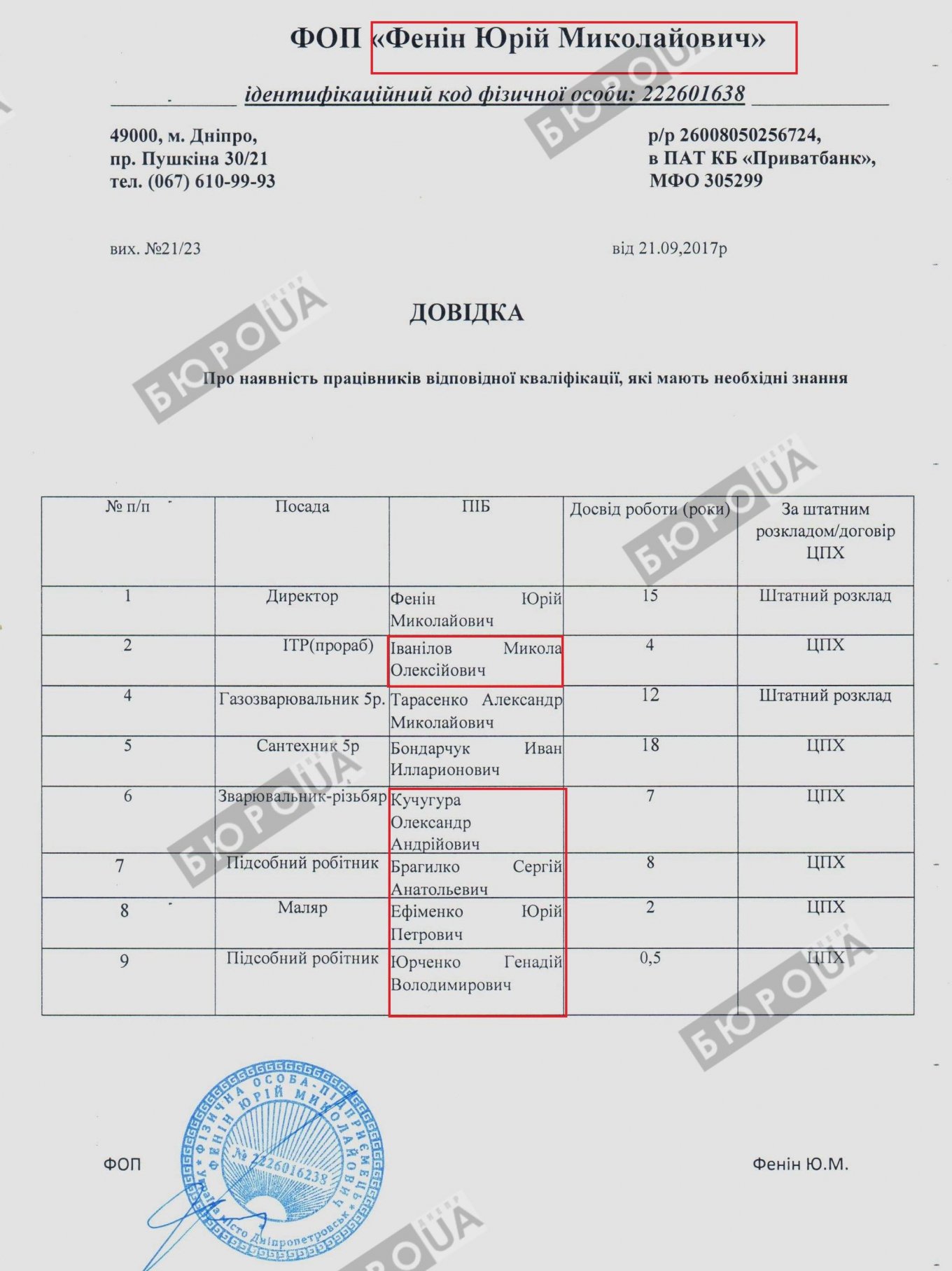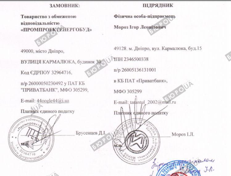 Тот самый Фенин, который (только не как прораб, а как ФЛП Юрий Фенин) участвовал в торгах КП «Центральный парк Глобы» на выполнение ремонта крыши «Днепровские зори» со своим работодателем Игорем Морозом. Хорошо знакомые друг другу люди разыграли подряд стоимостью 540 тысяч гривен. Победителем стал ФЛП Игорь Мороз.