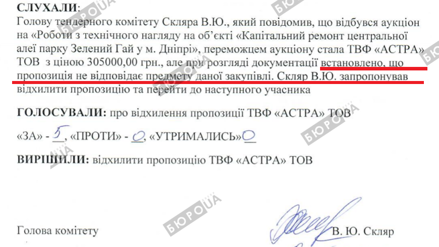 — При рассмотрении документации установлено, что предложение не соответствует предмету данной закупки. Голова тендерного комитета В.Ю.Скляр предложил отклонить предложение и перейти к следующему участнику, — цитата из протокола.