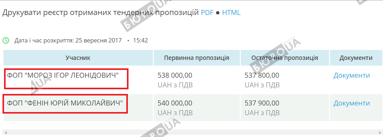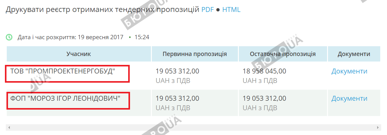 В тендере принимали участие ФЛП Мороз Игорь Леонидович и ООО «Промпроектэнергобуд». Цена предложения ФЛП составила 19 053 312 гривен, ООО запросило за свои услуги 18 958 045 гривен.