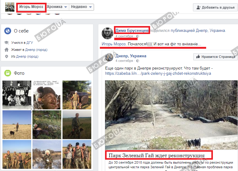 Игорь Мороз и руководитель компании «Промпроектэнергобуд» Дмитрий Брусенцев хорошие знакомые. 4 сентября Брусенцев опубликовал на странице Мороза в Фейсбук новость о реконструкции парка Зеленый гай, поделившись с другом грустью из-за «ненужного внимания» к реконструкции со стороны прессы.