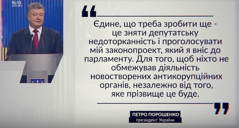 Президент Петр Порошенко уверял: «…Приближенный или отдалённый человек от президента, премьера, правительства, парламента или кого-либо - это его не защитит от обоснованных антикоррупционных расследований… Я не для того пришел на должность президента, чтобы кто-то пытался, используя моё имя или мои связи, зарабатывать на этом. Те, кто ближе - реакция будет ещё более жёсткой…Ни для кого, в случае объективных претензий правоохранителей, адвокатом работать не собираюсь. И таким вообще не место моей команде… Индульгенций в борьбе с коррупцией сейчас не выдают. А тот, кто будет выдавать, руки коротки. Будет нести ответственность по украинскому закону… Как начать борьбу с коррупцией? Начните с того, что посадите трёх своих друзей… Побеждать коррупцию – это не означает просто голосование за Антикоррупционное бюро или голосование за законы по борьбе с коррупцией. Коррупция имеет конкретную фамилию, конкретное имя, конкретного человека, который должен сидеть в тюрьме…».