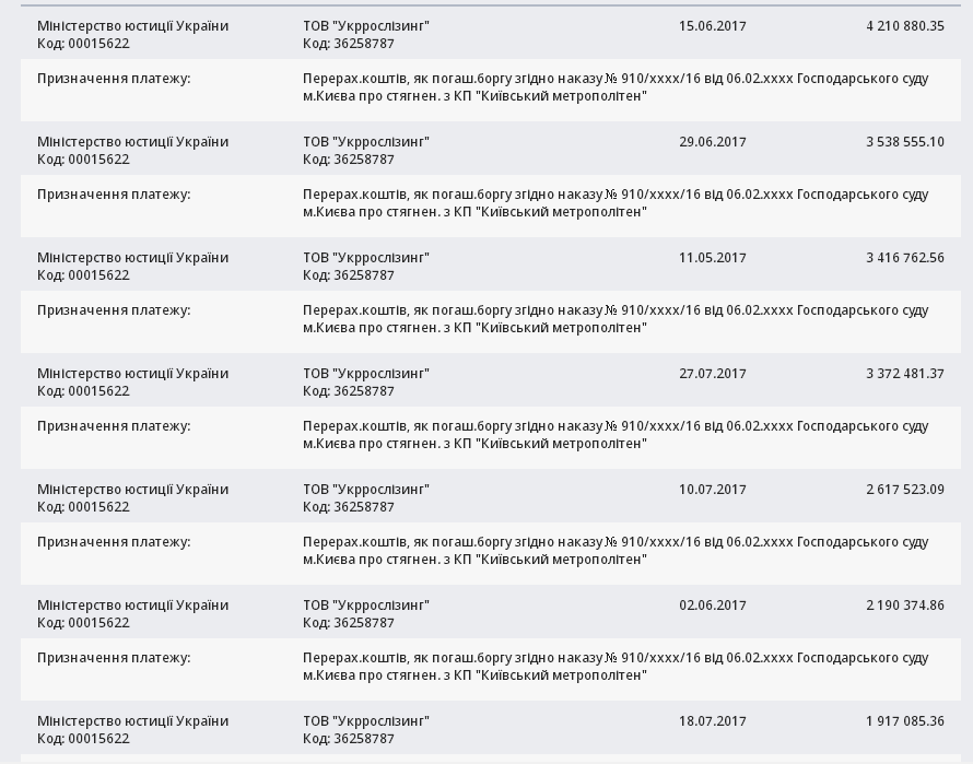Исполнительная служба Министерства юстиции оперативно отреагировала на решения судов. Уже 21 марта 2017 года с Киевского метрополитена принудительно взыскали в пользу Укррослизинга 90,4 млн грн. "Принудительные" платежи продолжались до 1 сентября прошлого года. Всего компании перечислили более 140 млн грн.
