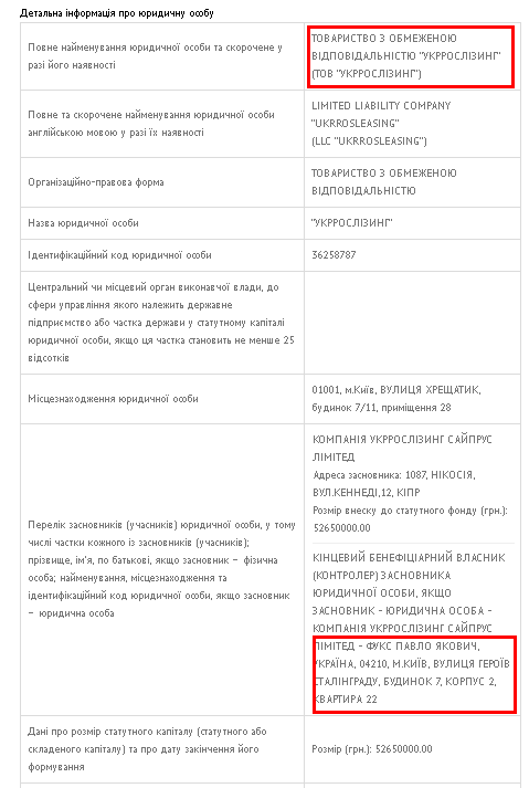 Официально Фукс появился в реестре как конечный владелец Укррослизинга в начале 2018 года. Непосредственный собственник 100% уставного капитала компании не изменился. Единственным учредителем фирмы осталась кипрская Ukrrosleasing Cyprus Limited.