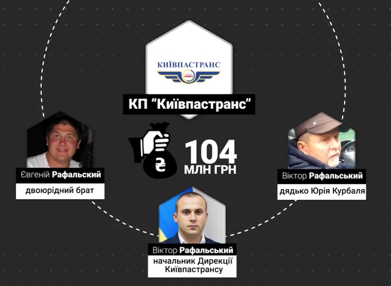Основателем проектного предприятия «София» является 57-летний Виктор Рафальский, который до этого занимался электромонтажными работами. По словам его матери, Рафальский на пенсии после инсульта и совсем не похож на бизнесмена. Секрет в том, что этот инженер – дядя руководителя коммунальщиков. Руководитель Дирекции «Киевпастранса» Юрий Курбаль является племянником Виктора Рафальского. Инженер Рафальский выигрывает тендеры, директор-монтажник подписывает документы, а начальник-племянник принимает работу. Семейная идиллия. Хотя сам Юрий Курбаль заявил журналистам, что он с Рафальским встречался всего один раз в жизни и не знает, что тот - его дядя. Вот такое наивное неведение. Да и дядя тоже делает вид, что не знаком с родственником.