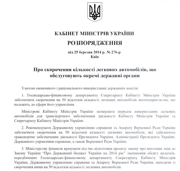 26 марта 2014 года Арсений Яценюк подписал распоряжение, которым обязал Кабинет министров сократить количество автомобилей наполовину, и рекомендовал то же самое сделать парламенту и президентскому ГУД.