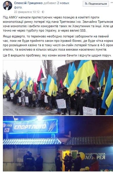 Активист Алексей Гриценко сообщал, что митинг под АМКУ организовал именно депутат от БПП Третьяков. «В АМКУ нагнали протестующих из-за позиции в комитете против монополизации рынка лотереи под господина Третьякова и Ко. Конечно, Третьяков хочет монополию и выбить конкурентов таких как Хомутынник и другие. Но это точно не из-за заботы об Украине, а из-за больших $$$», - писал Гриценко в facebook.