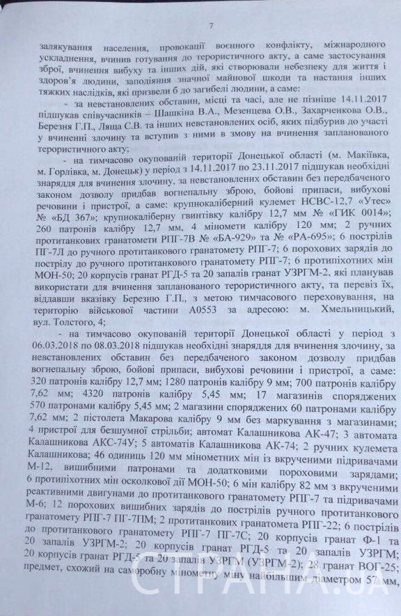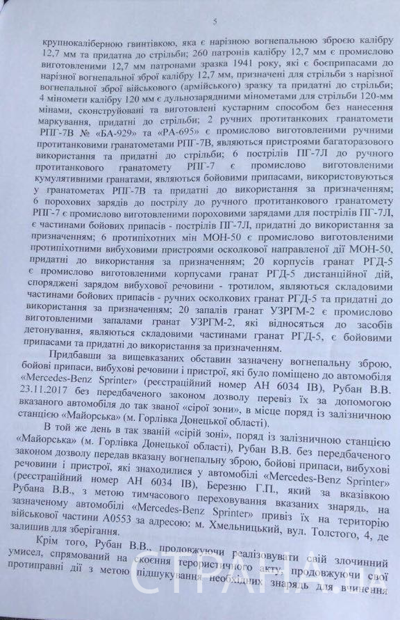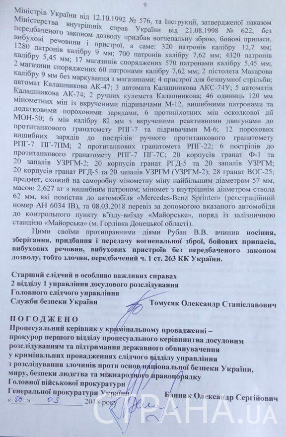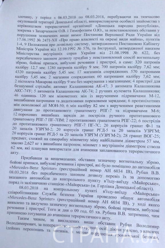 В распоряжении журналистов оказался текст подозрения Рубану. Публикуем документ полностью. Переговорщику вменяют подготовку террористического акта и незаконное владение оружием. В тексте документа говорится о подготовке покушения на президента Украины, а также на первых лиц государства в Киеве.