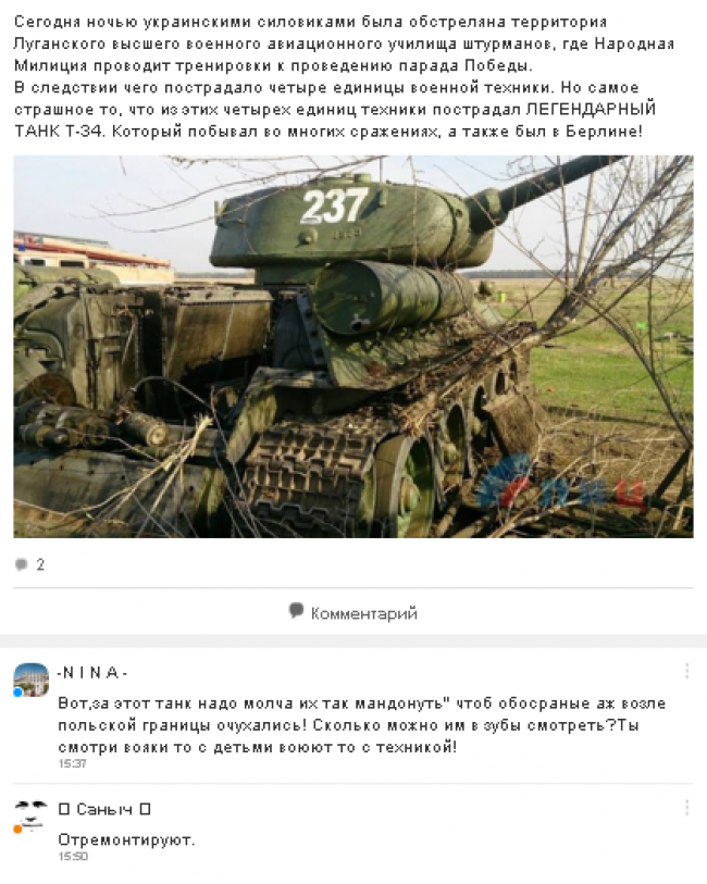 Новая киношная постановка террористов в Луганске должна была показать «народу Донбасса», что «укропы-каратели» сорвали «парад к 9-му мая», обстреляв место тренировок террористов с танками времен Второй мировой войны, и сорвав «Минские соглашения».