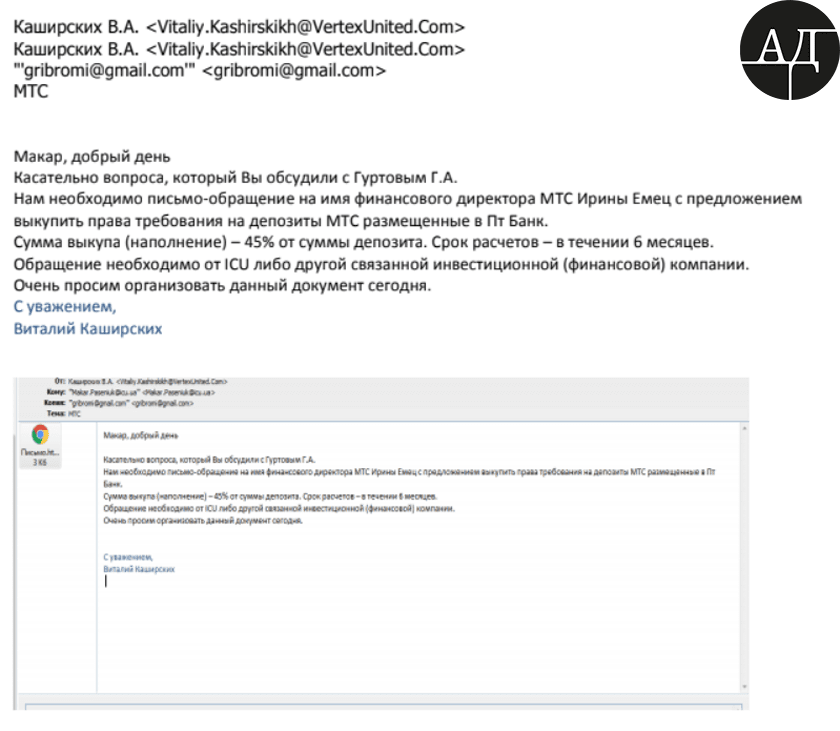 21 сентября 2015 года Виталий Каширский из VertexUnited (Кауфман-Грановский) пишет Макару Пасенюку (управляющий директор и партнер ICU) в копии письма: Григорий Гуртовой (глава наблюдательного совета и совладелец Платинум Банка) - в теме письма «МТС». Из этого письма следует, что Пасенюк, бывший на момент заключения депозитных договоров членом НС ПТБ, обсуждал с Гуртовым содержание письма-обращения на имя финансового директора МТС Ирины Емец с предложением выкупить права требования по депозиту МТС.