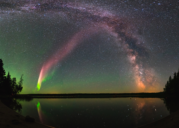 Полярное сияние, свечение атмосферы, один из старейших ударных кратеров на Земле, снег и лед, звезды, городские огни и часть Международной космической станции… Все это оказалось в одном кадре. Ярче всего, конечно, красно-зеленое полярное сияние, его оттеняет оранжевое свечение атмосферы, окаймляющее дугу земного шара.