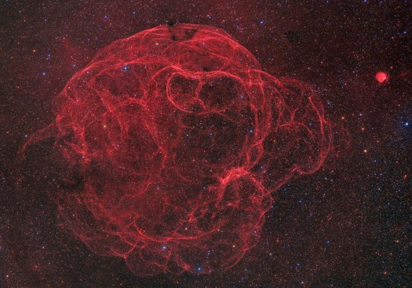 Клубок спутанных светящихся нитей на фоне Млечного пути – великолепная цветная панорама остатка сверхновой Шарплесс 2-240, он же Симеиз 147 на границе созвездий Тельца и Возничего – по вполне понятной причине носит название Туманность Спагетти.