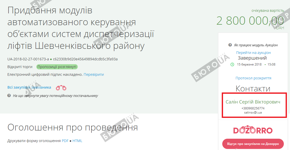 Подряд достался «И.М.Бест», чьё ценовое предложение составило 4 158 000 гривен.