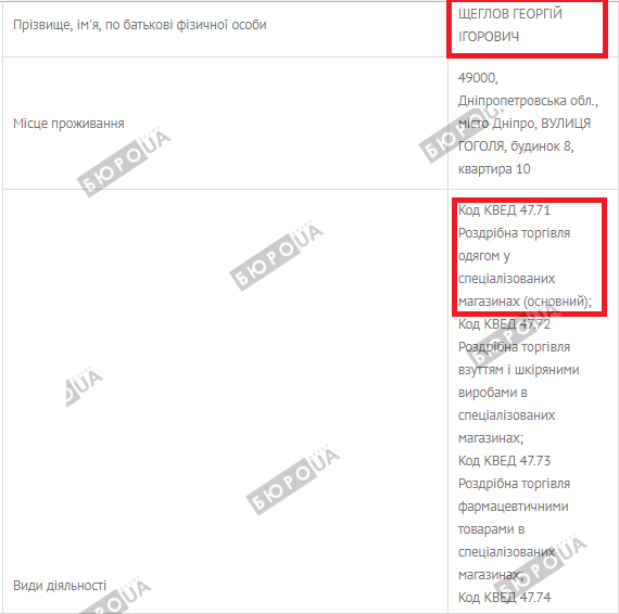 Как ФЛП Щеглов зарегистрировался в конце 2013 года. Основной вид деятельности по КВЭД – «розничная торговля одеждой в специализированных магазинах».