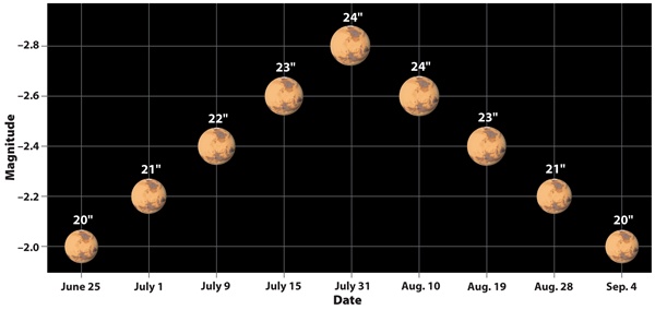 На рисунке показаны относительные угловые размеры Марса в противостояниях 2003, 2018 и 2832 годов. Первое из показанных было названо величайшим, а в последнем случае Марс будет проходить противостояние в наихудший момент.