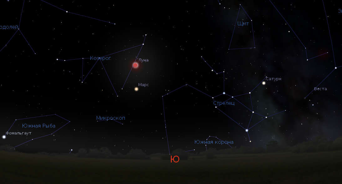 А тем, кому повезет с погодой («небо будет») Луну и Марс можно найти с помощью карты южной части неба. Карта построена в виртуальном планетарии Stellarium.