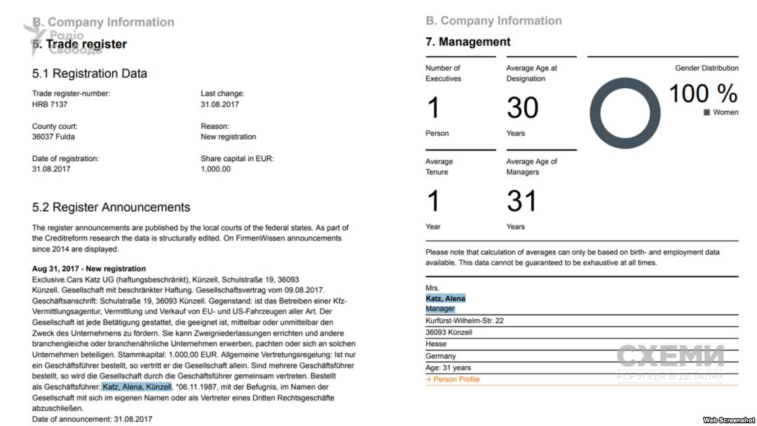 Кроме украинского телеканала "112 Украина", у семьи Катцев, как обнаружили "Схемы", есть еще один бизнес. Это торговля подержанными автомобилями в Кюнцелле. Фирма имеет "родственное" название – Exclusive Cars Katz. Всего на сайте на это время представлен выбор из 13 автомобилей с пробегом. Средняя стоимость – 40 тысяч долларов. Фирма с уставным капиталом в 1000 евро записана на жену Катца.