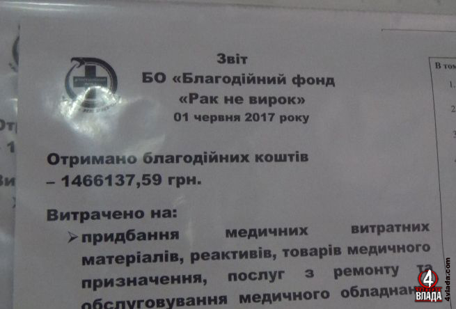 Отчет БФ «Рак — не приговор» вот такого образца можно увидеть в Ровенском онкодиспансере вблизи терминала. Но он не отражает реального сбора средств с пациентов
