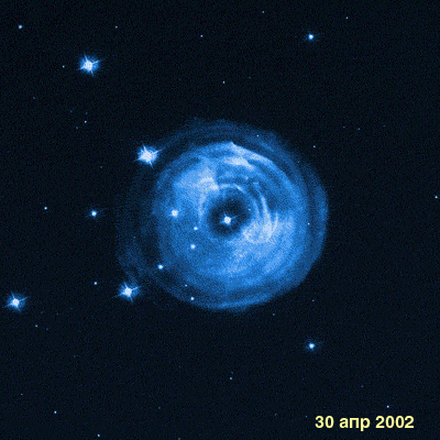 Самый известный случай светового эха V838 Единорога. Буква V означает переменная, цифра – порядковый номер переменной звезды в созвездии. В маленьком созвездии Единорога больше 800 переменных звезд! V838 Единорога в начале 2002 года пережила вспышку, световой эхо которой наблюдалось в течение несколько лет. Чем больше времени проходит с момента вспышки, тем больше область, в которой отражается свет. Интересно, что именно скорость расширения освещенной части туманности, равная скорости света, и подтверждает, что для V838 Единорога мы видим не реальное расширение физической оболочки звезды, а бегущее световое эхо.