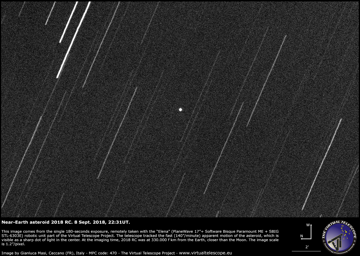 В этот раз астероид 2018 RC прошел на расстоянии всего 218300 километров от поверхности нашего планеты, что чуть дальше, чем половина расстояния до Луны.