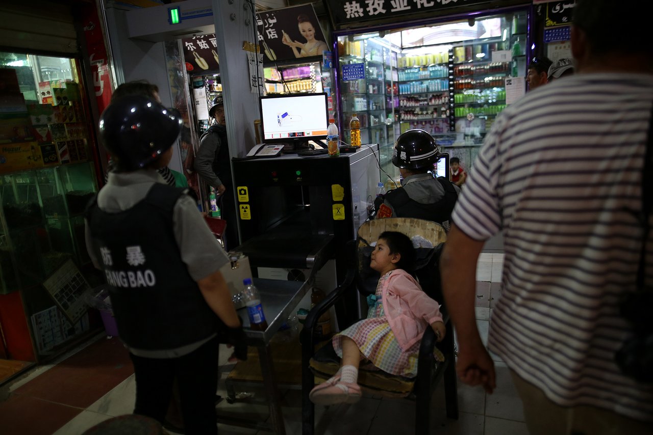 Я пытался найти знакомых, но не нашел даже домов, в которых они когда-то жили. Зато на каждой улице, посмотрев в любом направлении, можно теперь увидеть обтянутый колючей проволокой полицейский пост. Видеокамеры висят всюду — на крышах домов, на прикрученных к стенам кронштейнах, на фонарях и на специально установленных над улицами металлических фермах. Город разбит на блоки, и при переходе из одного квартала в другой каждый уйгур обязан предъявить пластиковый ID, просветить сумку, сканировать зрачок, а в некоторых случаях — отдать полицейскому для ознакомления свой телефон. Эта же процедура ожидает их в банке, в больнице, в супермаркете и в подземном переходе. Улицы патрулируются броневиками, спецназом и бригадами составленных из уйгуров добровольных дружин, периодически останавливающих прохожих для проверки личности. Трое таких дружинников, заметив, что я сфотографировал полицейского, заставили меня удалить снимок и не скрываясь ходили за нами остаток вечера.