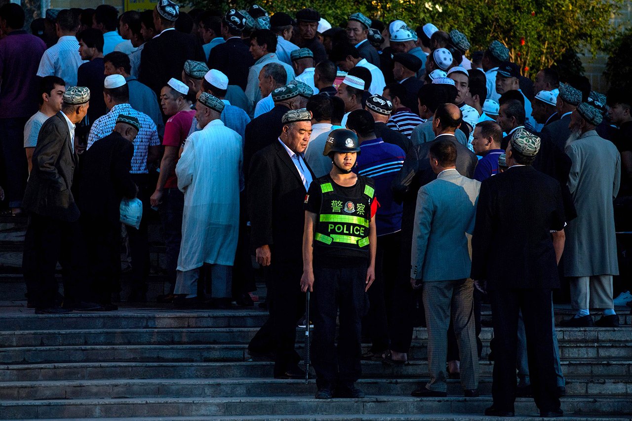 Китайский полицейский у центральной мечети Кашгара перед утренней молитвой, 26 июня 2017 года