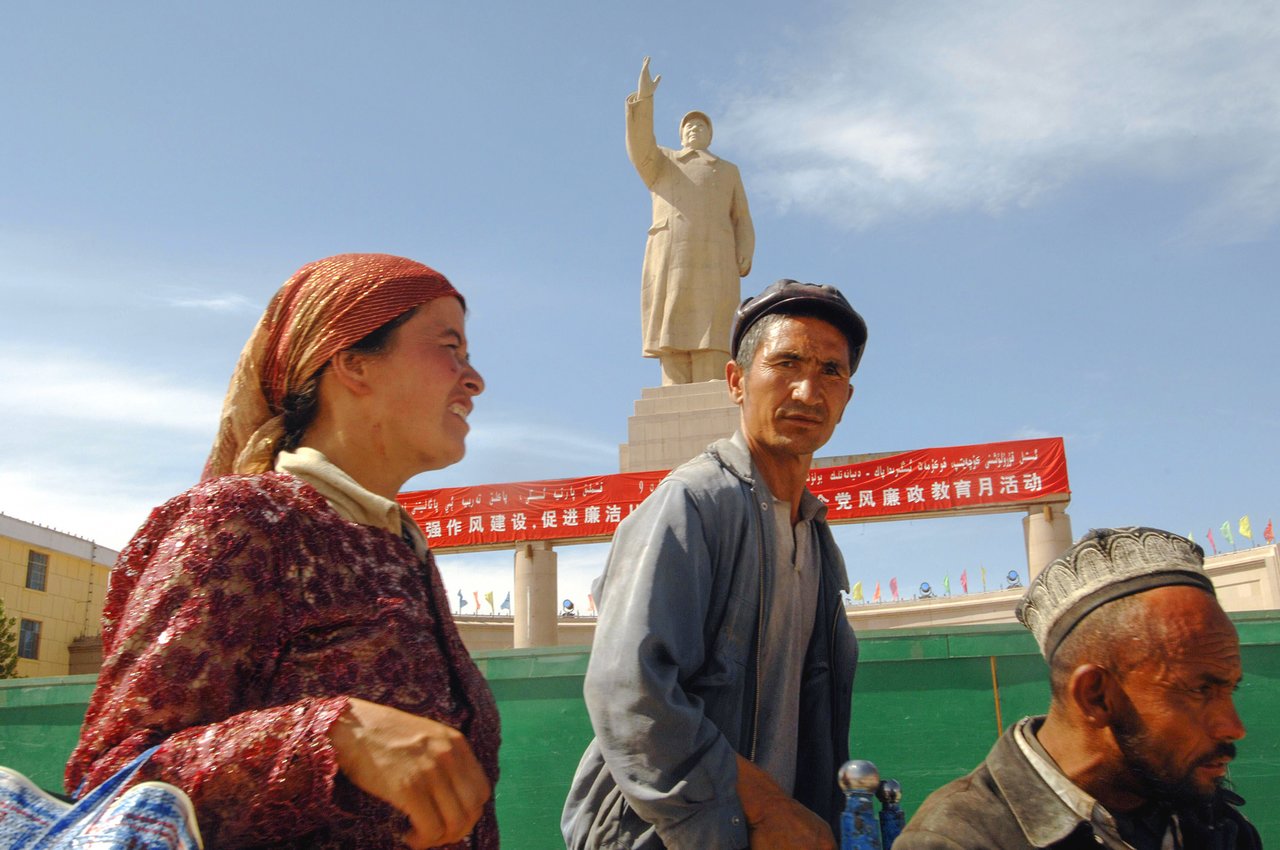 Уйгуры на Народной площади в Кашгаре, где незадолго до этого установили 20-метровую статую Мао Цзэдуна, 16 августа 2009 года